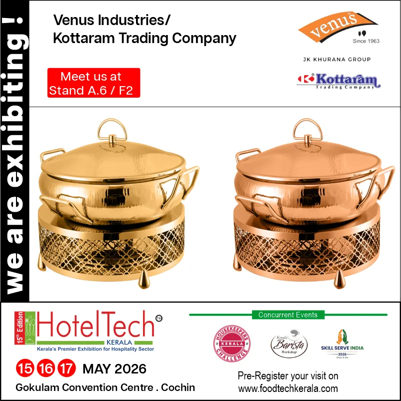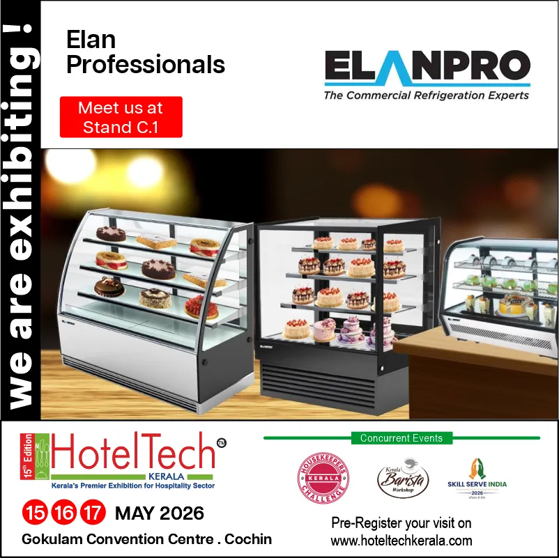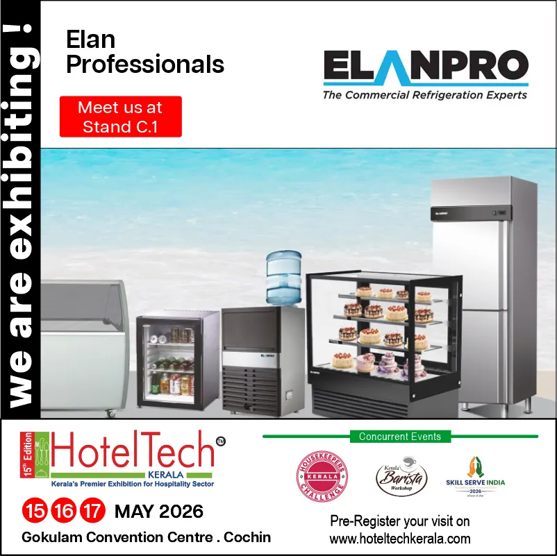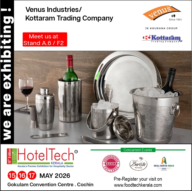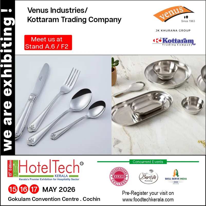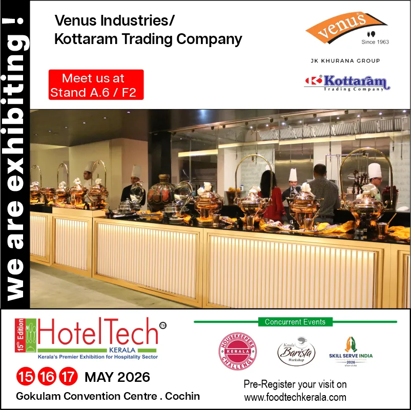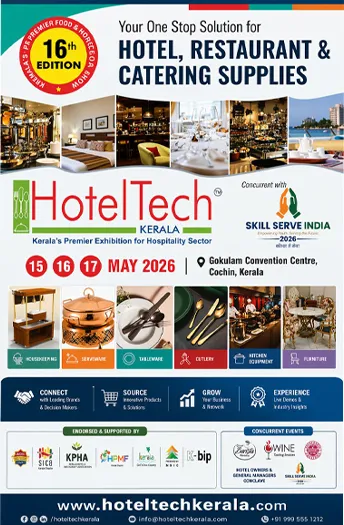 Cochin is again hosting the 16th Edition of Kerala’s Premier Hospitality Expo-HotelTech Kerala 2026 to be held from May 15-17, 2026 at Gokulam Convention Centre, Kaloor, Cochin. The exhibition is supported and endorsed by various associations including Association of Approved & Classified Hotels of Kerala, SICA-Kerala Chapter, Kerala Professional Housekeepers Association, HPMF-Kerala Chapter, Chief Engineers Forum Kerala and Chamber of Vembanad Hotels & Resorts, Kumarakom. Concurrent events being organised are the Skill India, Barista Workshop, Housekeepers Challenge & Wine Tasting Session. The event offers companies to showcase their products and services to the HORECA sector and offers a unique opportunity to penetrate this growing market in Kerala. Exhibitors also get a golden opportunity to meet leading institutional buyers, especially from the Hotels, Resorts, Restaurants & Homestays from all over Kerala on a single platform. The event will be the platform for leading suppliers of products related to the Food & HORECA sector.