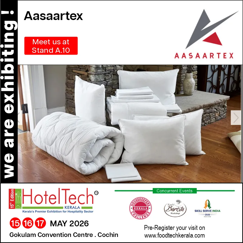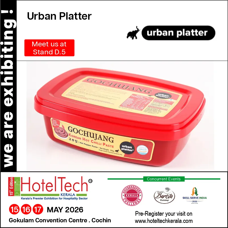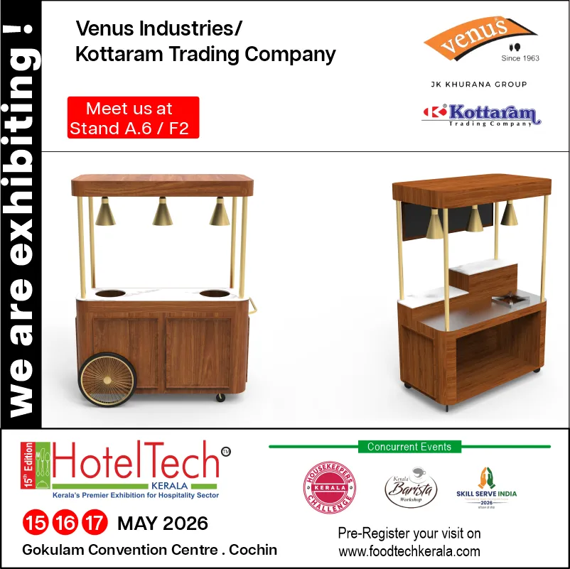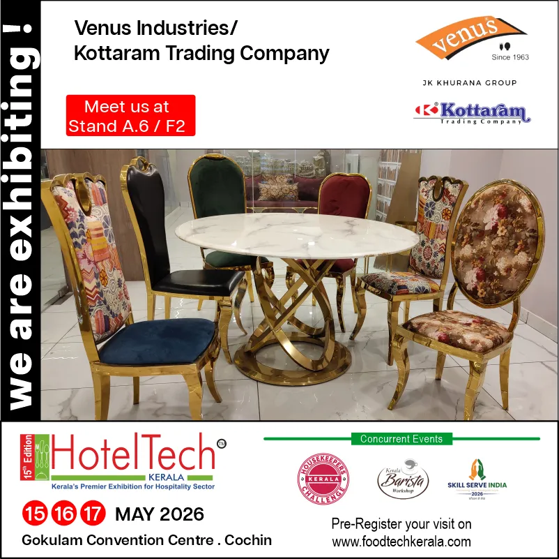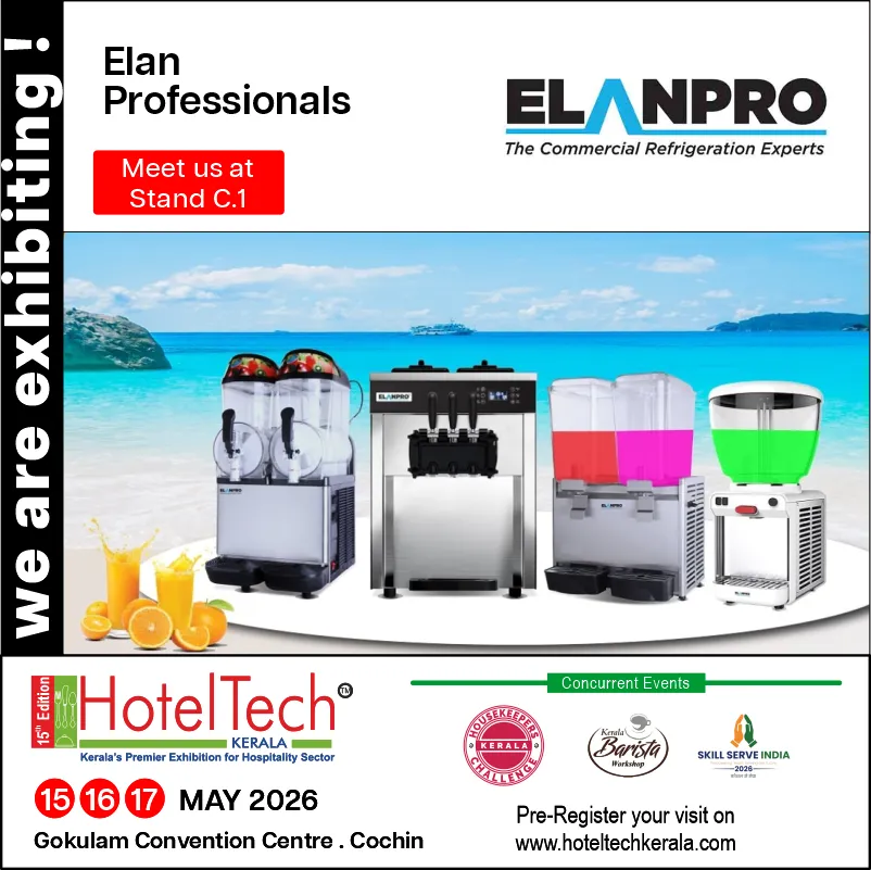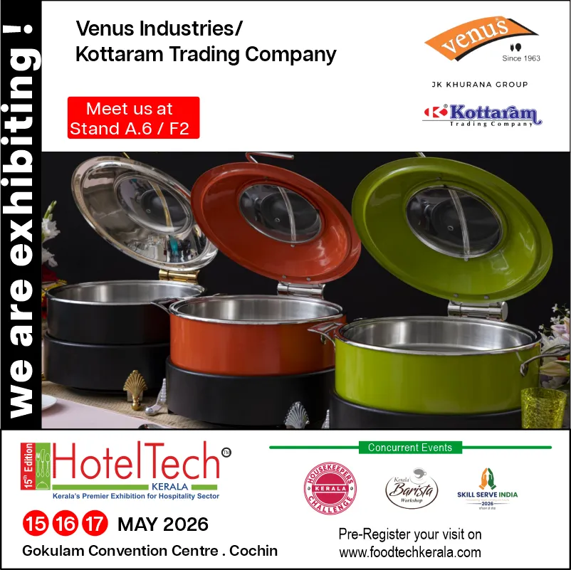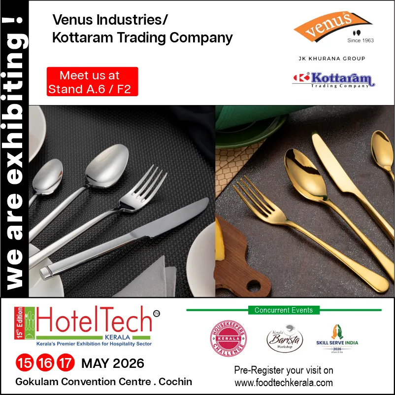 Cochin is again hosting the 16th Edition of Kerala’s Premier Hospitality Expo-HotelTech Kerala 2026 to be held from May 15-17, 2026 at Gokulam Convention Centre, Kaloor, Cochin. The exhibition is supported and endorsed by various associations including Association of Approved & Classified Hotels of Kerala, SICA-Kerala Chapter, Kerala Professional Housekeepers Association, HPMF-Kerala Chapter, Chief Engineers Forum Kerala and Chamber of Vembanad Hotels & Resorts, Kumarakom. Concurrent events being organised are the Skill India, Barista Workshop, Housekeepers Challenge & Wine Tasting Session. The event offers companies to showcase their products and services to the HORECA sector and offers a unique opportunity to penetrate this growing market in Kerala. Exhibitors also get a golden opportunity to meet leading institutional buyers, especially from the Hotels, Resorts, Restaurants & Homestays from all over Kerala on a single platform. The event will be the platform for leading suppliers of products related to the Food & HORECA sector.